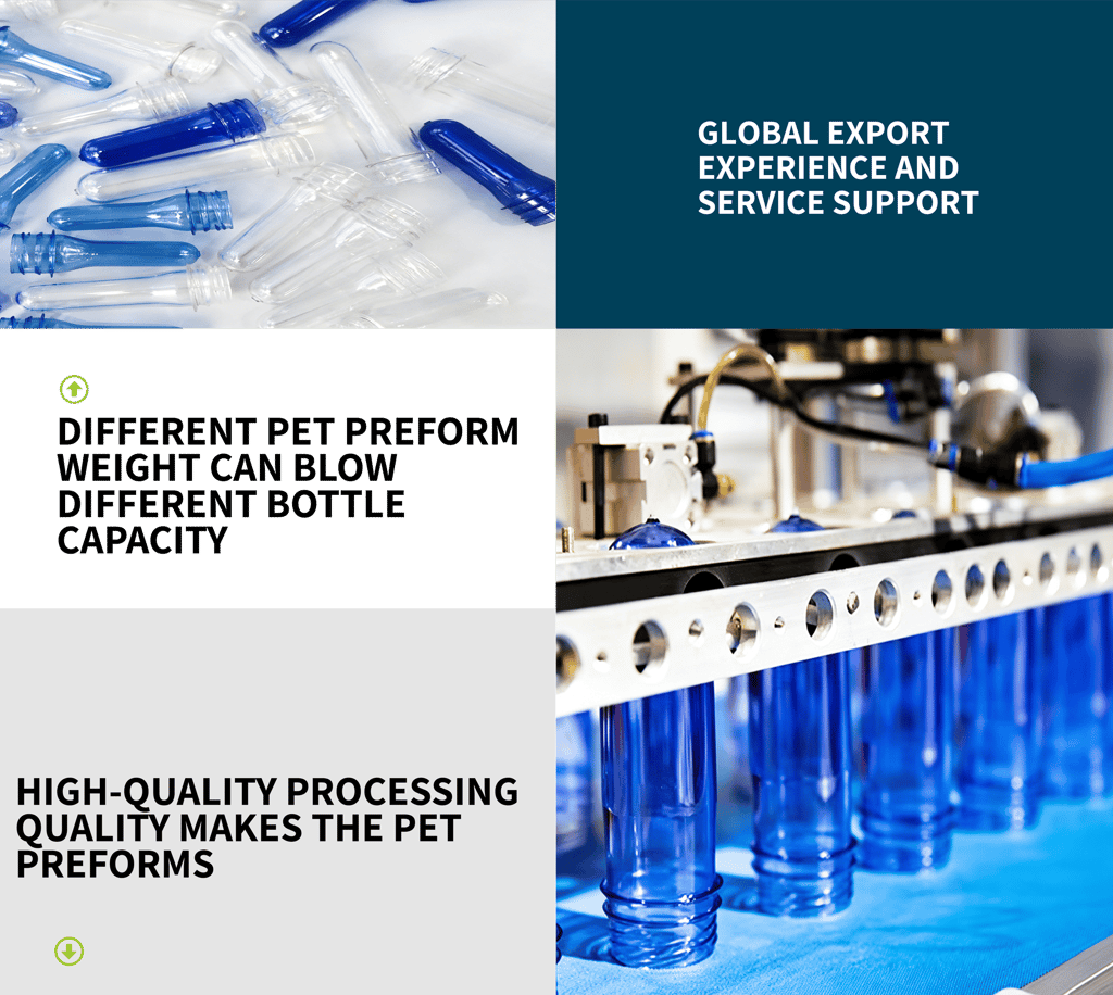PET preform is a semi-finished product made from 100% virgin food-grade PET using injection molding, used for producing bottles for mineral water, beverages, edible oil, and daily chemicals. Available neck sizes include 28mm PCO 1810/1881, 30mm, 38mm, 45mm, 55mm, 85mm, 100mm, etc.